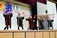 式典終了後の祝宴は、市老人クラブの田口悦郎会長の乾杯の音頭で始まりました。ステージでは、合川保育園の園児によるお遊戯や合川鳳扇会の皆さんによる舞踊、フローラル合川教室の皆さんによる大正琴などが披露され、楽しい歌と踊りを観賞しながら楽しい時間を過ごしました。