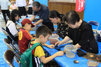 会場では、卓越技能者による「漆の箸づくり」や「銅板を使った木の葉お皿づくり(秋田県板金工業組合)」、「万華鏡づくり(秋田県ガラス・サッシ商工協同組合)」、「海苔巻きづくり(秋田県日本料理技能士会)」、「ミニ花置台づくり(鷹巣建設技能組合、北秋田建設技能組合)」など11種類のものづくり体験ができるブースが設置され、子どもらは技能者から手順や作り方を習いながら、ものづくりを体験しました。各ブースでは、子どもらが熱心に制作した完成品を両親に見せて、親子で喜び合う光景も見受けられました。