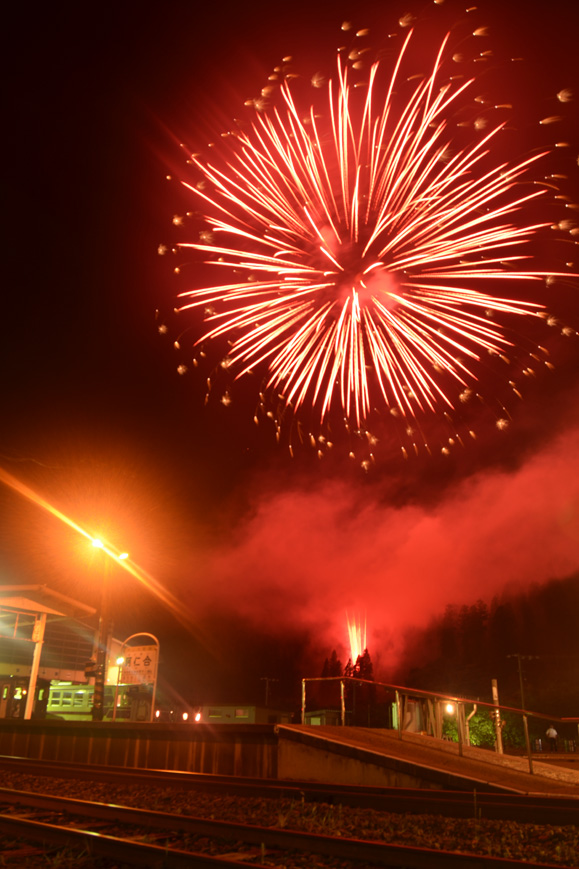 メインの花火大会は、阿仁の花火大会実行委員会(片岡信幸委員長)の主催。午後7時30分に「精霊に祈りを込めて」と題した、スターマインと4号玉10発の慰霊花火が打ち上げられて始まった花火大会では、はじめに主催者を代表して片岡実行委員長が「皆さんの協力で54回目の花火大会を開催することができた。先輩たちが築いてきた大会を今後も続けていきたい。今夜は阿仁の花火を楽しんでいってほしい」などとあいさつしました。