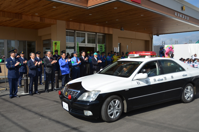 全国地域安全運動出動式が、10月11日(火)に北秋田警察署前で行われ、参加者は地域の安心安全を守る防犯活動への士気を高めました。
