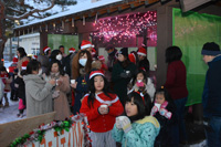 フェスティバルの初日を飾るこの日は、朝から降った雪で市内はすっかり冬景色となり、午後4時過ぎにサンタクロースの衣装を着た参加者たち約80人が元気に鷹巣駅前コミュニティステーションKITAKITAを出発。クリスマスの音楽を流してイベントをPRしながら商店街を歩き、メイン会場となる米代児童公園に到着しました。公園では、温かい飲み物やスープが振る舞われ、午後5時頃に公園内に設置された電飾の明かりが灯ると参加者や見物客から歓声が上がりました。