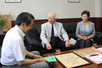 子育てしやすい職場づくりが評価され、秋田県子ども・子育て支援知事表彰を受賞した社会福祉法人鷹巣地の塩会・認定こども園しゃろーむの丹波望理事長と小塚光子園長が、8月11日(火)に市役所を訪れ、津谷市長に受賞を報告しました。