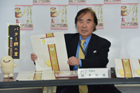 日本バター餅協会(村井松悦会長)が作成を進めていた「バター餅販売用の包装紙」と「パンフレット」が完成し、3月31日、市役所で記者会見が行われて披露されました。