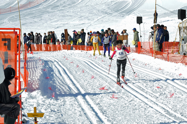 また、距離競技では、前方の選手に追いつこうと、息を弾ませて懸命に滑る選手の姿が随所に見られました。コース沿いには選手の父兄らが陣取り、目の前で一生懸命に滑る、わが子や同級生らに熱い声援を送っていました。
