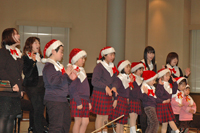 第一部では、「もろびとこぞりて」「ひいらぎかざろう」などの賛美歌を独唱を交えながら演奏しました。独唱を担当する団員は緊張した表情で歌い始めましたが、演奏が進むにつれて次第に笑顔が見られるようになりました。続いて、MMCが「オー・ホーリーナイト」「アヴェマリア」をしっとりと歌い上げ、会場内はクリスマスの雰囲気に包まれました。また、クリスマスソングのコーナーでは「あわてんぼうのサンタクロース」や「サンタがまちにやってくる」を振付をしながら元気に歌い、観客を楽しませました。
