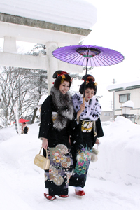 鷹巣神社での祈祷を済ませた女性たちは、通称「女の神様」として知られる元町の三吉神社にもお参り。この後女性たちは、中心商店街のにぎわいづくりに一役買おうと、そのままの正装姿で鷹巣駅前の目抜き通りを行進し、商店や道行く人たちから注目を浴びていました。