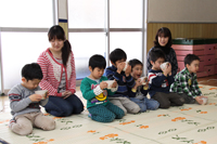 お茶会では、小坂社中のみなさんがお茶の作法を説明しながら、園児1人ずつに和菓子と釜の湯から点てた抹茶を振舞いました。園児たちは、立ち雛が描かれた大きな茶碗を小さな手に持ち、ゆっくりお茶を味わっていました。中には、お茶がおいしくてお代わりを要求する園児もおり、小坂さんはうれしそうに「そういう時は、お続きちょうだいいたします、と言うんですよ」と園児たちにお茶を点てていました。