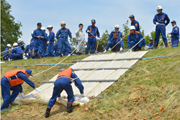 この後、参加した団員は消防署員の指導により各工法についてそれぞれ、土のうの積み方など作業手順の講習を受けました。 講習後には実施訓練が行われ、実施部長である小塚毅総務部長の号令のもと、団員らはそれぞれ習得した工法を、きびきびとした動作で作業し、完成させました。