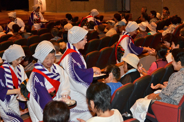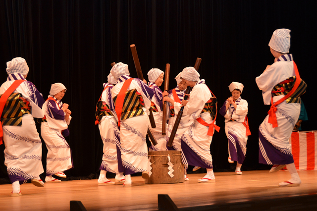 2番目に登場したのは、熊野神社餅搗き踊り保存会による「熊野神社餅搗き踊り」。米内沢新町におよそ400年ほど前から伝えられており、当時は未婚の男性たちの娯楽として自然に歌いだされたものです。赤い衣裳に黄色のたすきを掛け、豆絞りのほっかぶりに草履履きで女装して踊られました。昭和30年代になると、自然に老若男女を問わず踊りの輪に入るようになり、夜が明けるまで踊り続けたこともある。現在は、熊野神社の例祭前夜祭にあたる8月29日に社前で奉納されています。無病息災、五穀豊穣、安産などの祈願をこめた踊りとして、富凶の如何を問わず欠かさず踊りが継がれています。今回は「餅搗き踊り」のほか「メラシ踊り」や「猫竜(ねこじゃ)」「通り音頭」「ケンバヤシ」が上演されました。また、踊りの後には踊り手たちがステージから降り、観客にお餅を手渡しました。