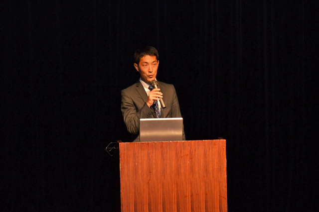 次にゲストの国際教養大学地域環境研究センターの日比野 浩平 氏が、スライドを使いながら、北秋田市をはじめ県内の伝統芸能について講演しました。講演で日比野氏は「秋田県は国内最多の16もの重要無形民俗文化財が存在します。しかし、演者の高齢化による後継者不足や、最近は娯楽が多様化していることから、若い人たちの民俗芸能離れなどの課題を抱えています。また、映像媒体での保存が現在、非常に少ない。大学では映像を保存するとともに、映像を使いながら継承者づくりのきっかけになればと思っている」などと述べたあと、当センターが製作しているウェブサイト『秋田民俗芸能アーカイブス』について説明しました。このサイトでは、県内の民俗芸能をジャンルや開催日などでも検索できるようになっているほか、県内の民俗芸能を映像で観ることができ、現在は300件を超える映像が用意されています。講演の後には、当センターが撮影した市内の民俗芸能のうち『太田番楽』、『上杉大名行列』、『幸屋渡番学』の3件をそれぞれ15分程度に編集した映像が上映されました。