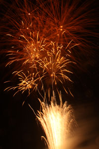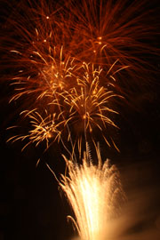 川幅約100mほどの阿仁川をはさんで対岸から打ち上げられる数々の花火は、間近に迫ってくる光のきらめきと山間に共鳴する轟音で迫力満点。フィナーレの「明日への希望の花が咲く」と題した小型煙火付スペシャルスターマインが夜空を焦がし、今年の大会を締めくくるまで、見物客は、美しい灯籠絵巻と山峡にこだまする花火との競演を堪能していました。