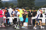 最初のエイドステーションで飲み物や軽食を口にするランナー