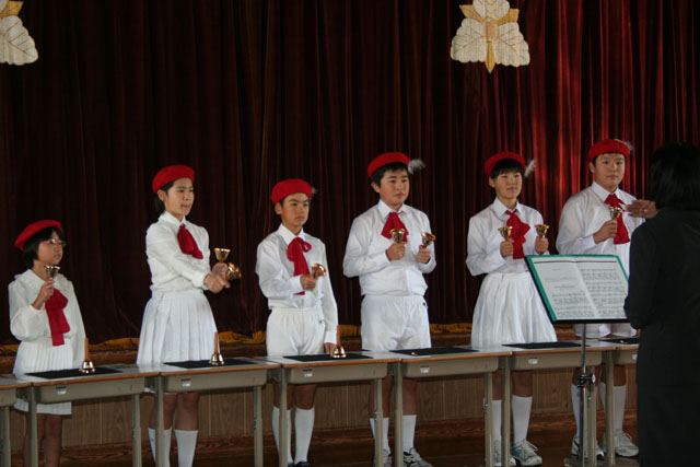 続いて、4〜6年生による「浜辺の歌」「ふるさと」のミュージックベルの合奏、1〜3年生によるダンス「スポーツキッズ 浦田っ子」、全校児童による劇「みんなの浦小物語(前編)」が次々と披露させました。「みんなの浦小物語」は、浦田小学校137年を劇で振り返る前編、後編合わせて約50分にのぼる力作。子ども達の元気ではつらつとした演技に会場から大きな拍手が送られました。