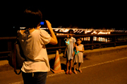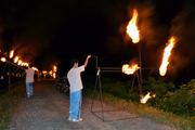 一方、阿仁川堤防が会場となった「合川まと火」は、午後7時30分から合川橋を挟み堤防約2にわたる水平まと火、20個の車まと火、「40回合川マトビ」の文字を浮かび上げた仕掛けまと火が中学生の生徒によって次々に灯されました。川面を赤く照らすまと火の幻想的な光景を観客の皆さん写真を撮りながら楽しんでいました。