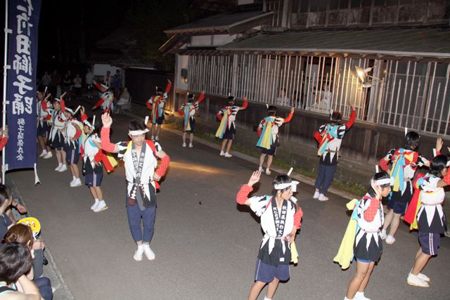 その後、手に扇などをもって踊る「奴踊り」、岡崎合戦の様子を表現した勇壮な「駒踊り」などが披露され、各各会場に集まった地区住民や帰省客などが暑さを忘れ郷土芸能に酔いしれていました。