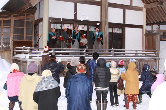 森吉地区の米内沢神社(鈴木正和宮司)では「節分祭(せつぶんえ)」が行われ、豆やみかんなどをまいて無病息災や商売繁盛を祈願しました。
