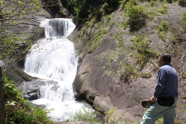 小又峡船着場で遊覧船を降りた観光客らは、大小の滝や瀑布をゆっくりと散策し、三階滝の前で記念撮影するなど秘境といわれる小又峡を満喫してました。