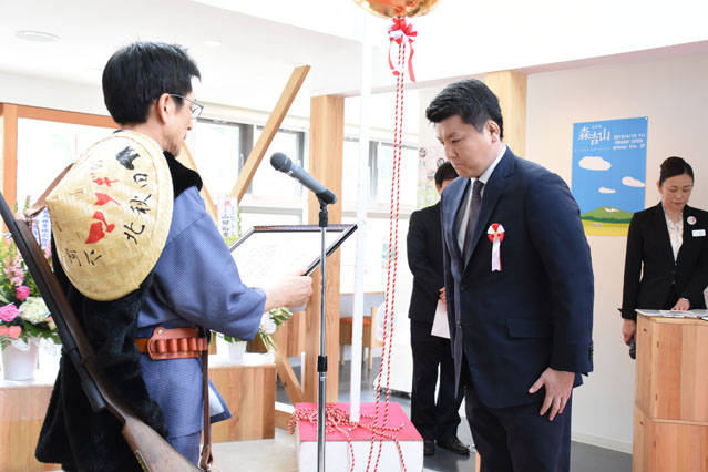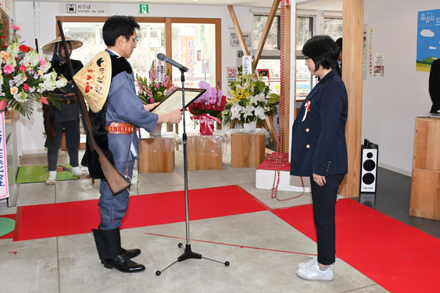式典では、グランドオープンを記念し、阿仁合駅玄関口で秋田犬の北斗君とマタギ姿の高橋地域おこし協力隊が参加者をお出迎えし、くす玉割りでは、司会の1、2、3、どうぞの声にあせて、勢いよくくす玉を割ると駅構内では集まった方々から拍手が湧き起こっていました。続いて、内陸線より、完成に向けてご尽力いただいた工事関係者への感謝状が贈呈されました。