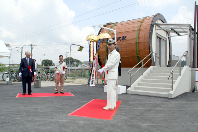 午後12時30分から行われた式典では、主催者を代表して長谷川弘JR鷹ノ巣駅長が「地域に根ざした駅舎という思いもあり、糠沢駅は地域の皆様のご賛同を得まして、綴子大太鼓のデザインの駅舎として完成しました。来年東北新幹線が青森駅まで開通することにより、この地域にもたくさんの観光客が訪れ、この駅舎により北秋田市の活性化になればと願います。どうか地域の皆様、この駅舎を可愛がって末永くご利用ください」とあいさつ。
