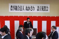 このあと、農事組合ぬかさわの設立祝賀会が糠沢自治会館でが行われ、出川代表理事は「米価の低下など農業を取り巻く状況はよくないが、未来に向かい土台のしっかりした明るく楽しい農業を目指す決意を新たにしている。ライスセンターの竣工を節目とし、組合員一同、一層努力を重ねます」などとあいさつ。その後、乾杯や万歳三唱などが行われ、関係者らが地域農業の発展を誓いました。
