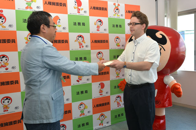 そのほか、イベントに合わせて大館人権擁護委員協議会による街頭啓発が行われ、1日人権擁護委員に委嘱された教育委員会学校教育課のロバート・ショーン・コリガンさんが人権擁護委員と共に市民に啓発パンフレットや啓発用品を配布しました。