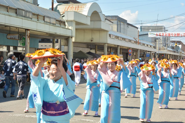 セレモニーの後に始まったふるさと踊りでは、横断幕を先頭に、綴子下町の大太鼓が豪快な音とともに行列を先導しそれに続いて、子ども太鼓、たかのすふるさと太鼓や各婦人会、鷹巣小学校児童、市内の企業から参加した踊り手で通りがいっぱいになりました。沿道の観衆からは、太鼓の演奏や美しい踊りに大きな拍手が送られました。