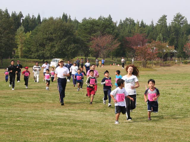 大会は、北秋田市スポーツフェスタの一環として行なわれ、マラソンを通じて、児童の体力向上と友愛協力の精神を養い、明るくたくましい児童の育成することを主旨に開催されています。この日は小学1・2年の親子マラソン(1)、小学3年生(1)、4・5・6年生(2.4)などの種目が行われ約120人が参加しました。