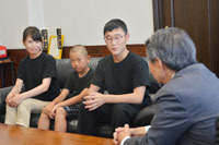 国立交流事業「第5回国立まと火」に参加した合川太鼓保存会などの皆さんが、8月19日(月)に市役所を訪れ、津谷市長に国立市のイベントでの活動の成果や感想などを報告しました。
