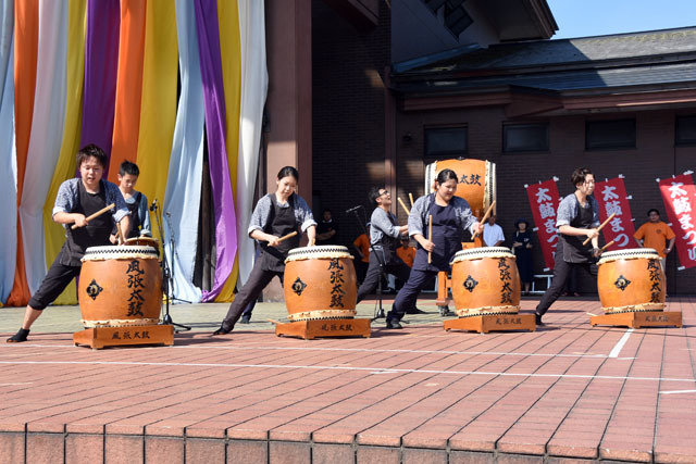 まつりは、はじめに綴子下町大太鼓保存会が登場し、ギネス記録に登録されている直径3.71メートルと3.18メートルの2張りの大太鼓を、雷鳴のごとく打ち鳴らし、さらには「ヤツパレ」といわれる棒術の使い手による力強い演舞と獅子踊りも披露され、太鼓まつりのオープニングを飾りました。