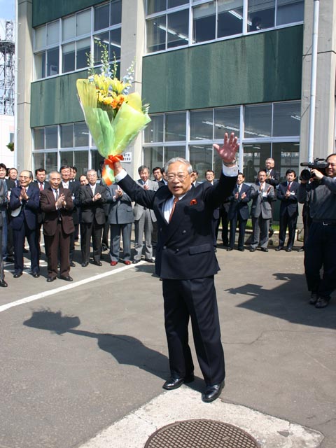玄関前で市民や職員らの出迎えを受けた岸部市長は、求めに応じて握手を交わし、また女性職員から花束を受け取ると万歳のポーズで花束を高くかざすなど、市民らの歓迎に応えていました。