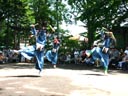 奉納は「とざい(東西)、とうざい〜東北災難穏やかに、枝も栄える御代の松・・・」と、太夫の口上で始まりました。最初に、子どもと大人の奴踊りが軽快な所作と艶やかな衣装で観衆の目を引くと、続いて勇壮な獅子踊りが披露され、大きな拍手を受けていました。また、小学6年生3人による「子獅子」の踊りもピタリと決まり、満場の喝采を浴びていました。