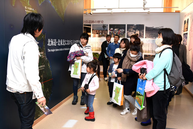 参加者は、大館能代空港に到着後に伊勢堂岱縄文館へ移動。縄文館を見学しながら、世界遺産登録を目指す伊勢堂岱遺跡の4つの環状列石や縄文人の暮らしについて説明を受け、北秋田市の魅力の一端に触れました。子どもたちは、縄文館前の残雪に大喜びで、雪の上を走ったり、雪玉を作って遊んでいました。