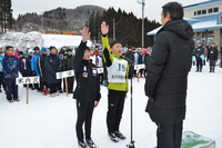 このあと、来賓を代表して北秋田市議会の松尾秀一議長と北秋田市体育協会の成田昭夫会長が、それぞれあいさつに立ち選手たちを激励。最後に合川小学校6年の小野寺理人(みちと)さんと木村慶(けい)さんが「いつもに比べて雪が少ない中、こうして頑張ってこられたのは、多くの人たちのおかげ。今日は感謝の気持ちを胸に、最後まで滑り切る。リオオリンピックに負けない、熱気あふれた大会にすることをここに誓います」と力強く選手宣誓をしました。