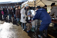セレモニーのあとには、恒例の餅まき予定されていましたが、足元が悪いため「餅渡し」に変更され、村井会長はじめ関係者が、集まった人たちに紅白の餅を一袋ずつ手渡しました。また、大太鼓の館前では、ミズキの枝に色とりどりの餅や「豊作祈願」、「合格祈願」などの短冊を取り付けた枝餅の限定販売も行われました。さらに、おしるこの無料サービスには、配布前からたくさんの人が行列を作り、あんこにとろける甘くて柔らかい餅に舌つづみを鳴らしていました。