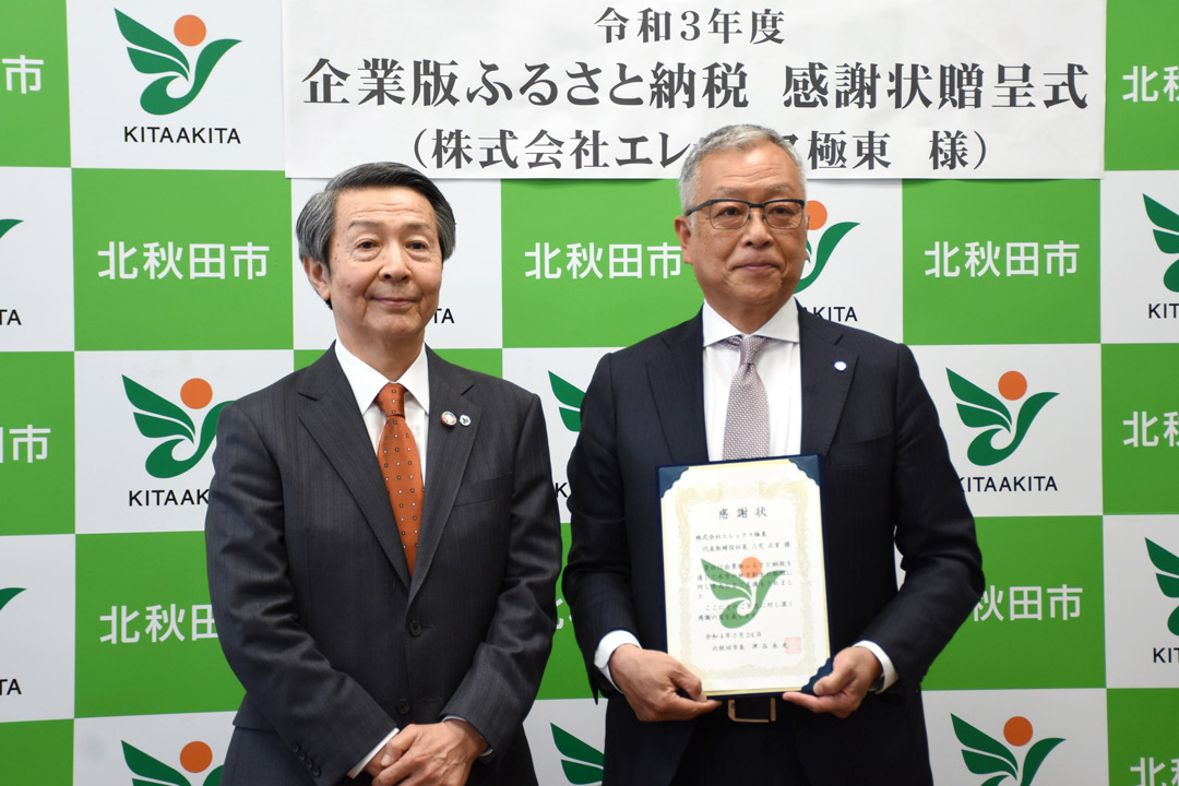 企業版ふるさと納税の感謝状贈呈式が、3月24日(木曜日)に市役所で行われ、北秋田市への寄付申出企業第1号となる株式会社エレックス極東へ感謝状が手渡されました。