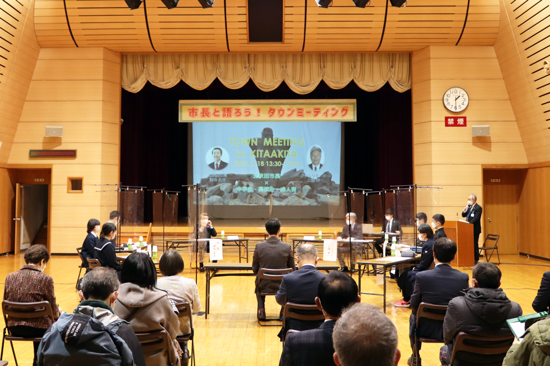 北秋田市のまちづくりや行政課題などについて、市長と市民が語り合う「市長と語ろう! タウンミーティング」が2月18日(土曜日)に交流センターで開催され、今回は高校生2人、中学生4人、成人者1人の7人が、異年齢交流のトークディスカッションを通して津谷市長と意見を交わしました。