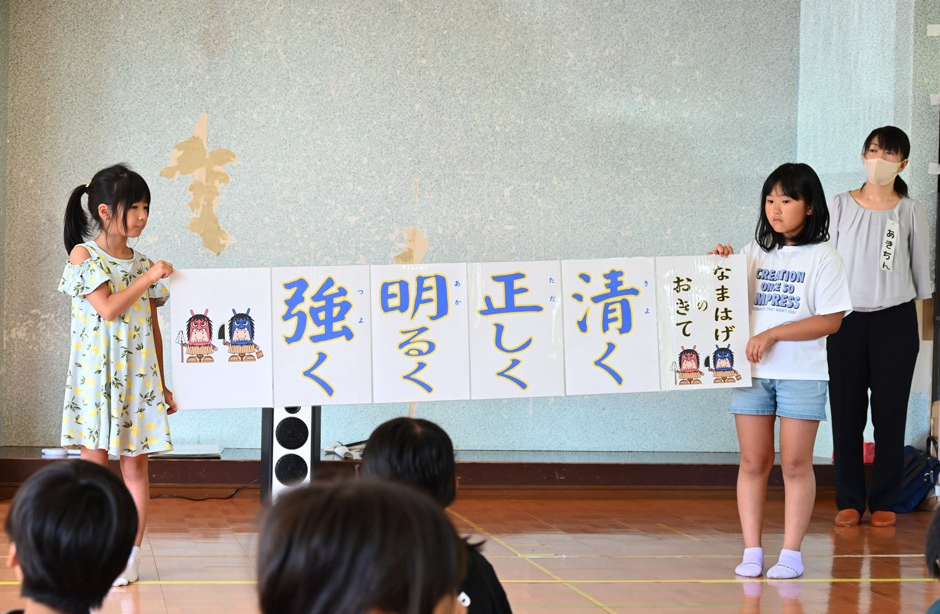 今回の授業は、「夏休み中、夏休み明けの楽しく安全な過ごし方」をテーマに行われました。講師の北秋田警察署綴子駐在所の松本巡査長と、大館少年サポートセンターの方々が、○×クイズを交えた寸劇を通して、万引きやけんか、SNSを使った悪口などがどのような非行や犯罪につながるのかを分かりやすく教えていました。