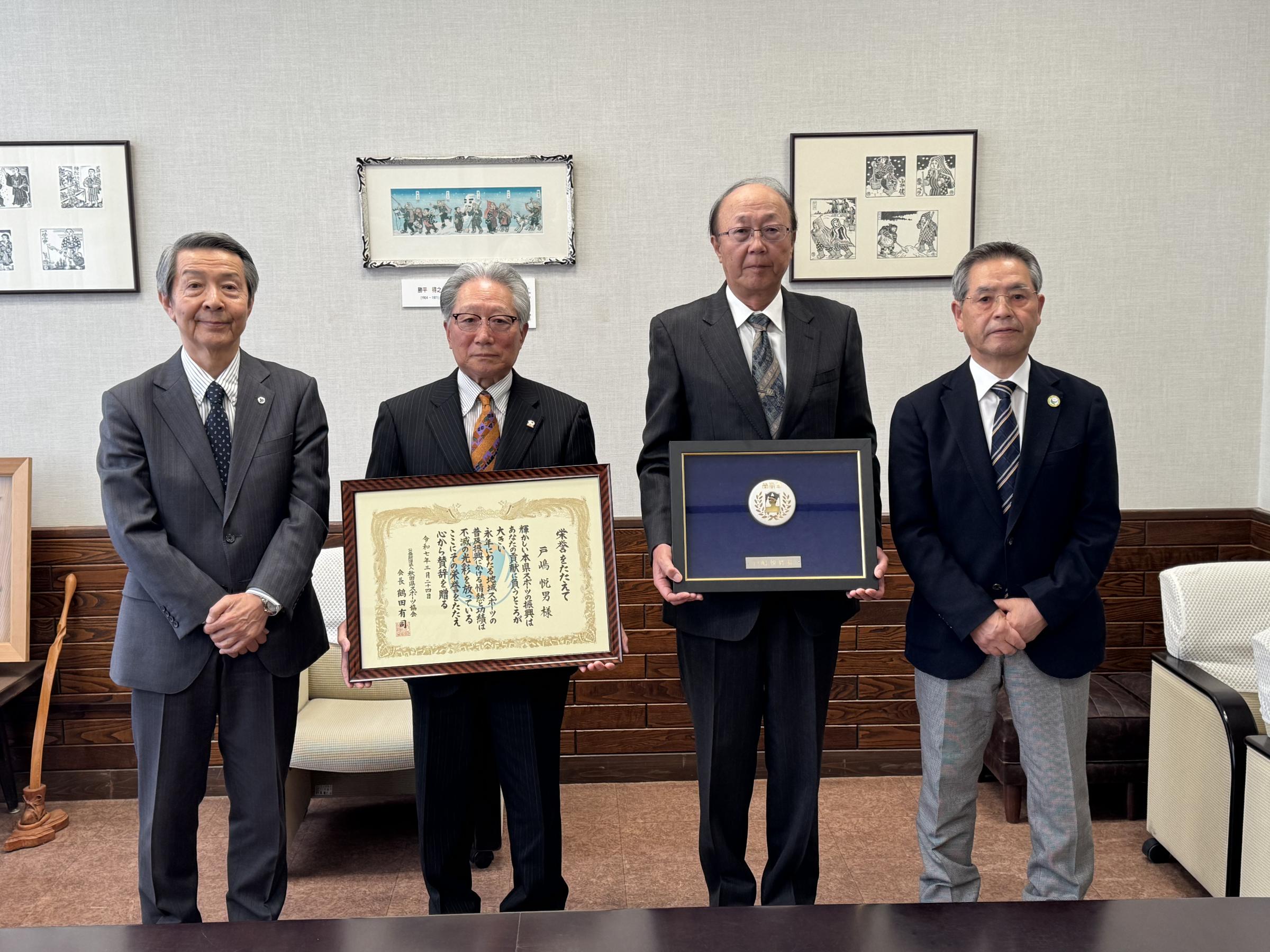 令和7年3月24日に秋田キャッスルホテルで開催された表彰式において表彰された戸嶋さんは、「このような賞を頂けるとは思ってもいなかった。受賞は終わりではないので、動けるうちは活動を続けたい。」と話され、津谷市長は「本当に栄誉ある受賞であり、おめでとうございます。今後とも陸上競技の発展にご尽力いただきたい。」とお祝いの言葉を述べました。